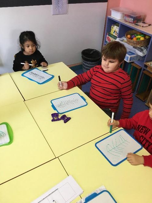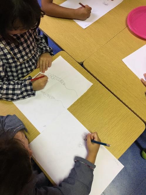 Pour les lignes obliques,il nous fallait gérer l’orientation du geste et maintenir la trajectoire rectiligne afin de réaliser un sapin. La description du geste par les élèves fut aussi une étape importante de l’apprentissage.