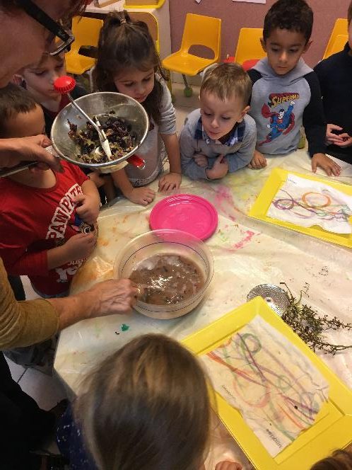 Ateliers langagiers autour de la description de ce fruit, réalisation d’un affichage mémoire sous la dictée des élèves, dessins d’observation en coupe et en grappe, empreintes de feuilles et réalisation de jus de raisin ont jalonné notre journée de découvertes.