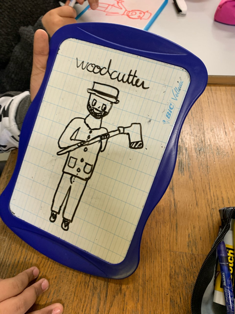 Nous avons débuté l’étude du conte par une lecture à voix haute pour travailler la prononciation anglaise des phrases. Par la suite, les élèves devaient relever tous les personnages présents dans le conte : The Little Red Riding Hood, the Mother,the Grandmother, the Woodcutteret the wolf.