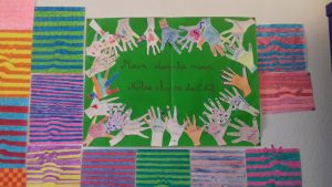 Chaque élève a réalisé sa main en trompe-l’œil en traçant des droites parallèles à l’extérieur de sa main puis des lignes courbes à l’intérieur .